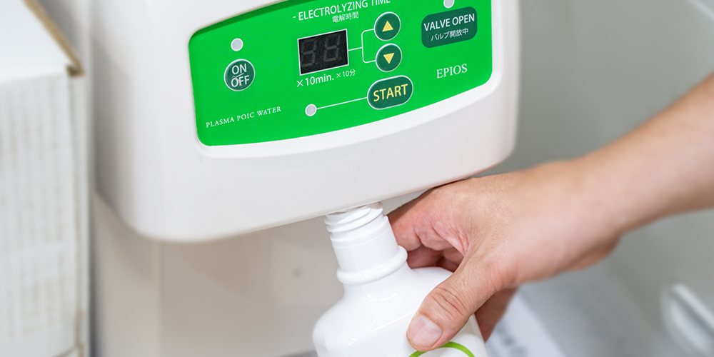 薬剤・薬品は一切使用しておらず、高純度の塩と超純水だけを電気分解して生成した殺菌水です。人体に元々備わっている免疫成分を有した殺菌水ですので安全にご利用ください。